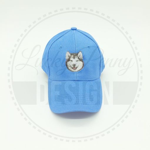 Alaszkai malamut mintával hímzett azúrkék színű baseball sapka.