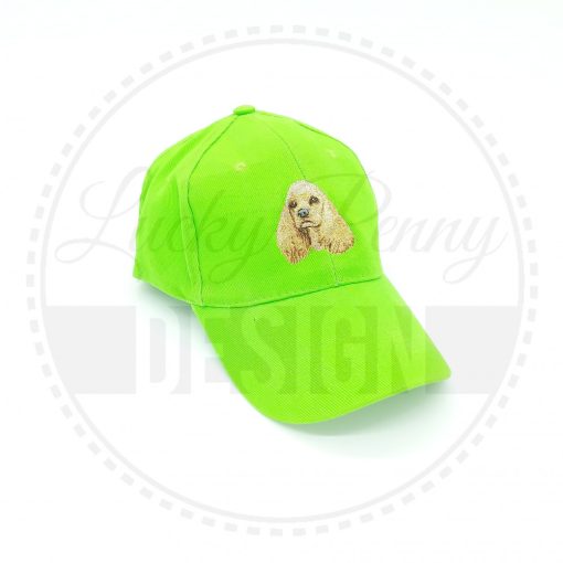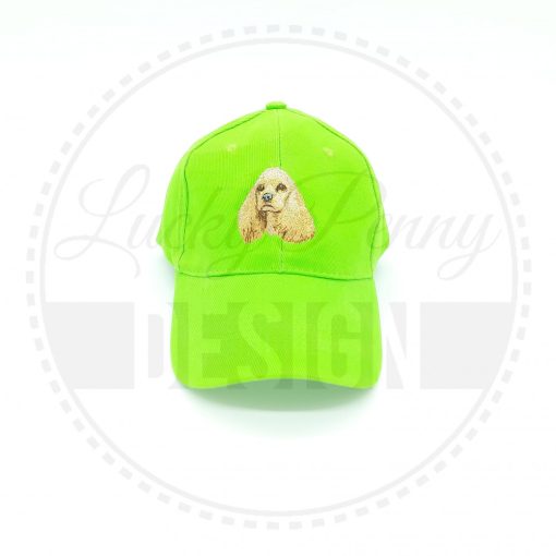 Amerikai cocker spániel mintával hímzett almazöld színű baseball sapka.