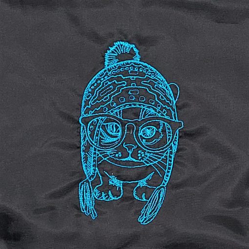 Hímzett sapkás-szemüveges macska mintával díszített fekete bevásárló szatyor.
