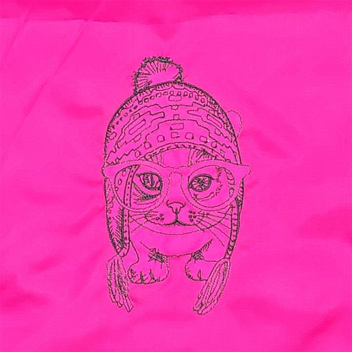 Hímzett sapkás-szemüveges macska mintával díszített neon rózsaszín bevásárló szatyor.