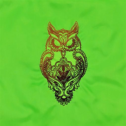 Hímzett háromszínű bagoly mintával díszített almazöld bevásárló szatyor.
