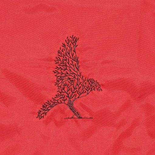Hímzett madár-fa mintával díszített piros hátizsák.