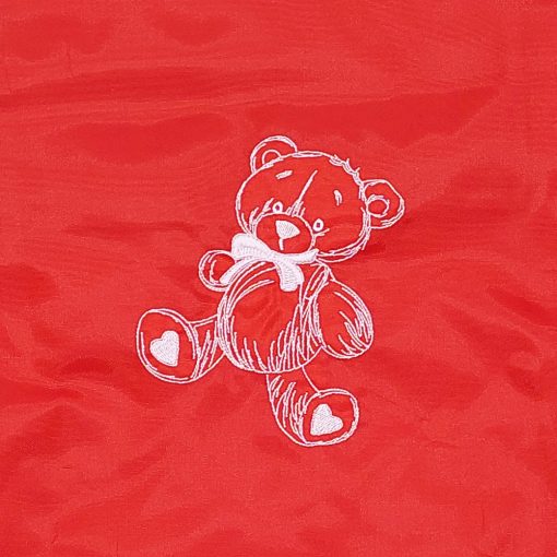 Hímzett teddy bear mintával díszített piros hátizsák.