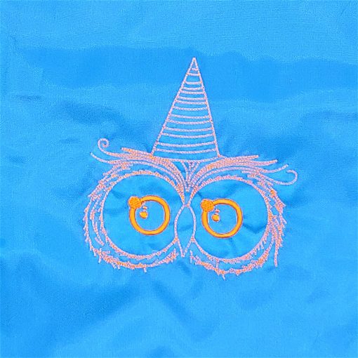 Hímzett bagoly kalapban mintával díszített azúrkék hátizsák.