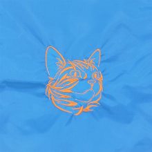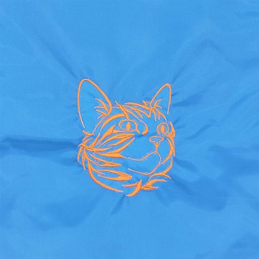 Hímzett jobbra néző macska mintával díszített azúrkék hátizsák.