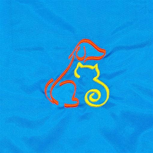 Hímzett kutya-macska ölelés mintával díszített azúrkék hátizsák.