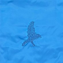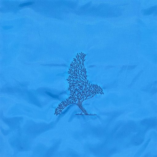 Hímzett madár-fa mintával díszített azúrkék hátizsák.