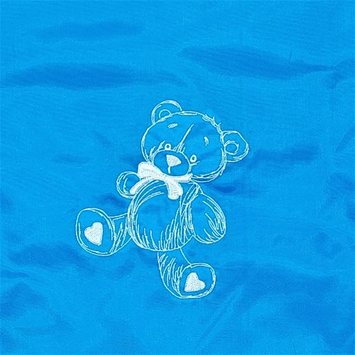Hímzett teddy bear mintával díszített azúrkék hátizsák.