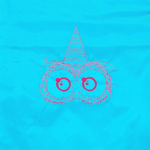 Hímzett bagoly kalapban mintával díszített türkiz hátizsák.