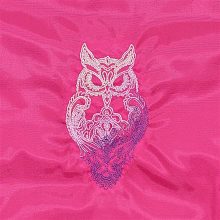Hímzett háromszínű bagoly mintával díszített fukszia hátizsák.