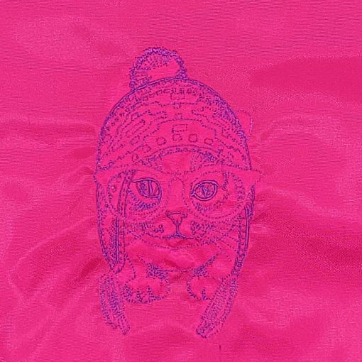 Hímzett sapkás-szemüveges macska mintával díszített fukszia hátizsák.