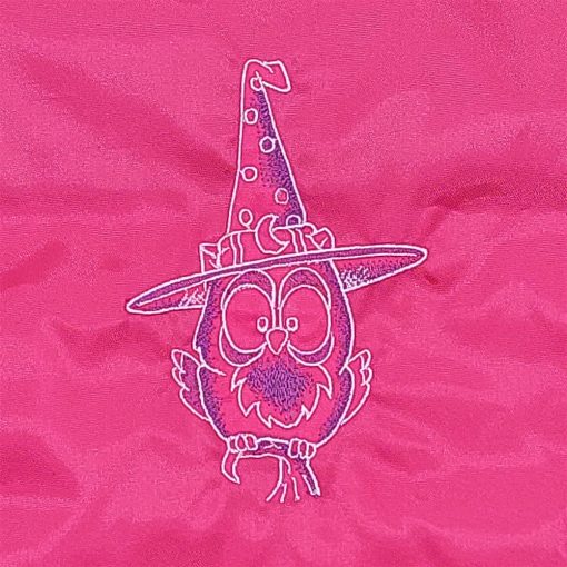Hímzett varázsló bagoly mintával díszített fukszia hátizsák.