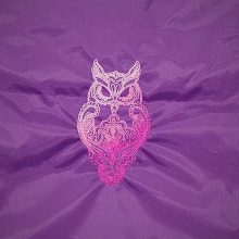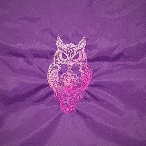 Hímzett háromszínű bagoly mintával díszített lila hátizsák.