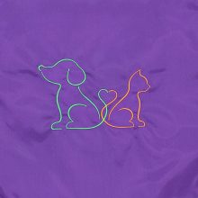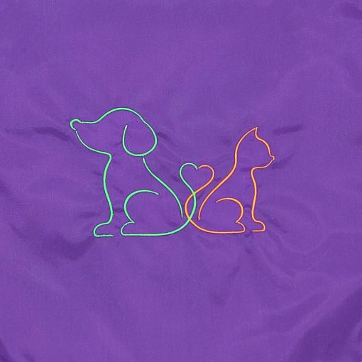 Hímzett kutya-macska barátság mintával díszített lila hátizsák.