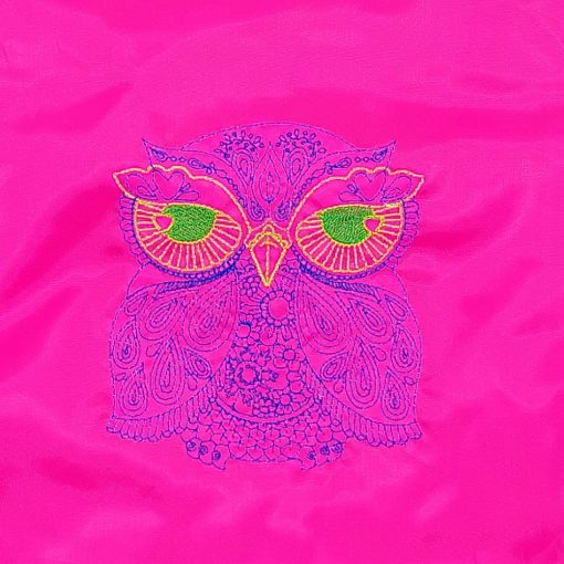 Hímzett nagy szemű bagoly mintával díszített neon rózsaszín hátizsák.