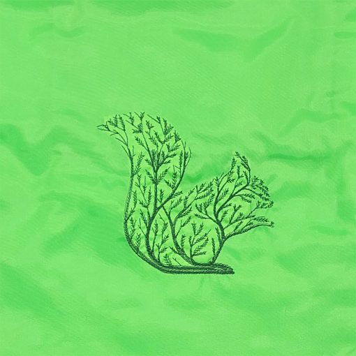 Hímzett mókus-fa mintával díszített almazöld hátizsák.