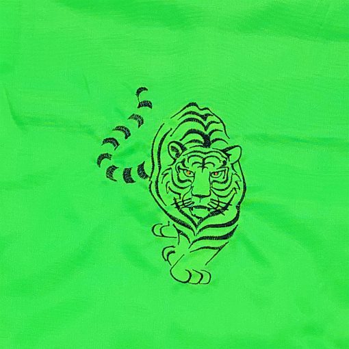 Hímzett tigris mintával díszített almazöld hátizsák.