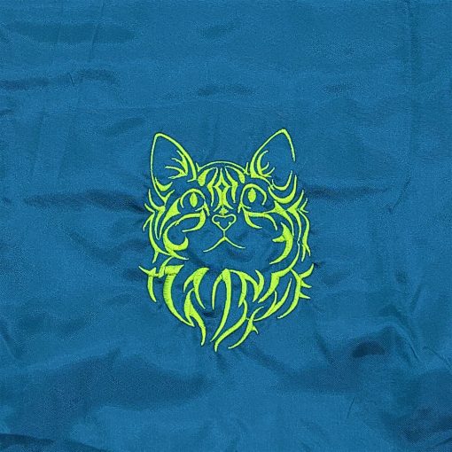Hímzett felfelé néző macska mintával díszített petrol kék hátizsák.