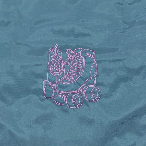 Hímzett görkorcsolya (magenta) mintával díszített petrol kék hátizsák.