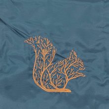 Hímzett mókus-fa mintával díszített petrol kék hátizsák.