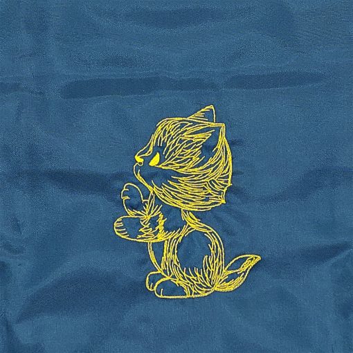 Hímzett vonalas macska mintával díszített petrol kék hátizsák.